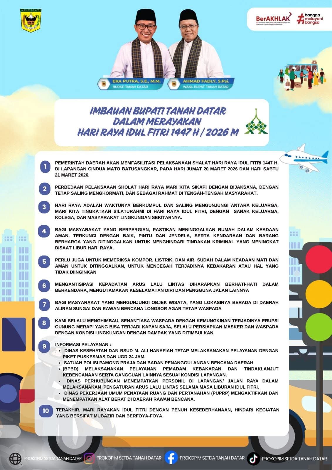 MEDIAINVESTIGASIMABES.CO.ID | BATUSANGKAR (SUMATERA BARAT) – Menyongsong Hari Raya Idul Fitri 1 Syawal 1447 H yang jatuh pada Sabtu, 21 Maret 2026, Bupati Tanah Datar Eka Putra, S.E., M.M., mengeluarkan imbauan khusus bagi seluruh masyarakat Luhak Nan Tuo. Dalam pesan yang disampaikan menjelang akhir Ramadan, Bupati menekankan pentingnya memaknai hari kemenangan dengan cara yang khidmat namun tetap sederhana.