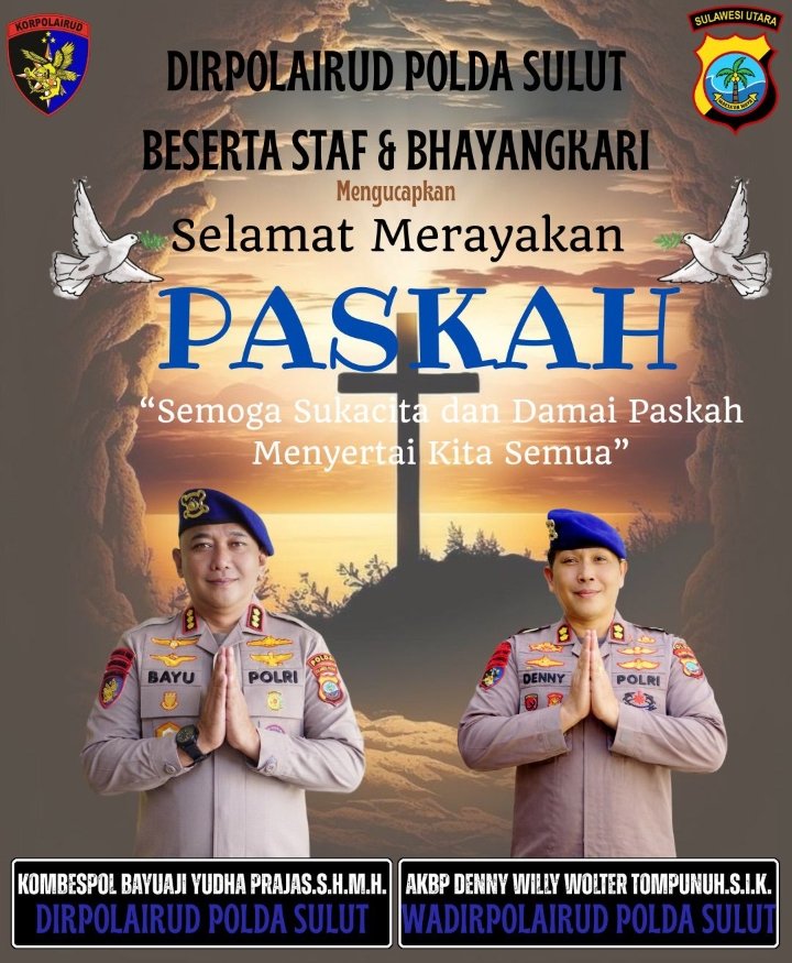 MEDIAINVESTIGASIMABES.CO.ID | BITUNG (SULAWESI UTARA) – Dalam rangka memperingati hari besar keagamaan umat Kristiani, Direktorat Kepolisian Perairan dan Udara (Ditpolairud) Polda Sulawesi Utara menyampaikan ucapan selamat merayakan Hari Paskah kepada seluruh umat Kristiani, khususnya yang berada di wilayah Kota Bitung dan sekitarnya.