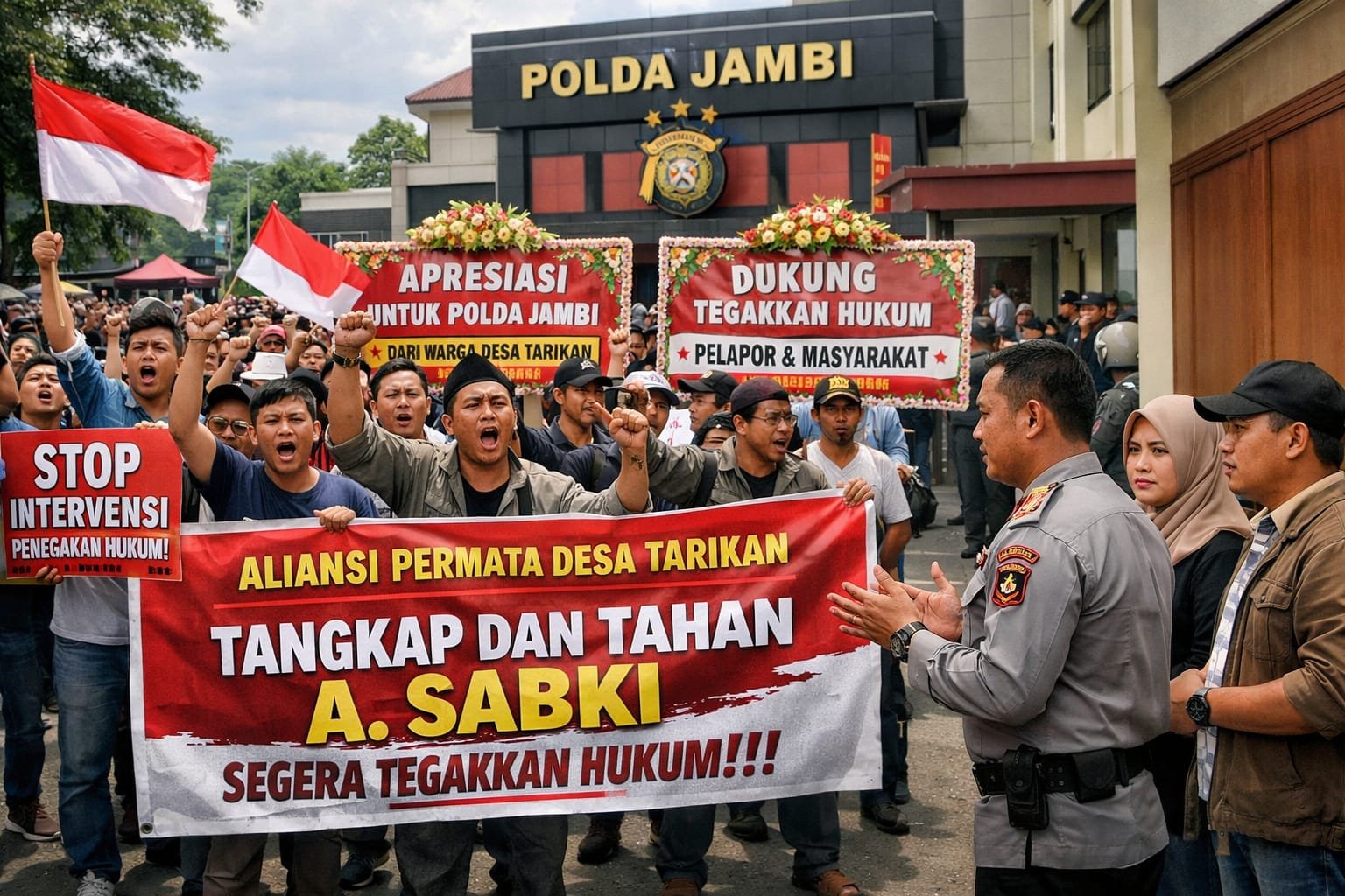 MEDIAINVESTIGASIMABES.CO.ID | PROV. JAMBI – Masyarakat Desa Tarikan yang tergabung dalam Aliansi PERMATA (Perjuangan Masyarakat Tarikan) Kabupaten Muaro Jambi mendatangi Polda Jambi untuk menyampaikan apresiasi atas ditetapkannya A. Sabki sebagai tersangka. Kamis, (16/04/2026).