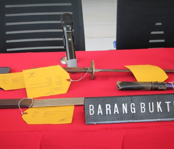 Dalam penangkapan tersebut, petugas turut mengamankan barang bukti berupa: 1 celurit bergagang ungu ±80 cm, 1 samurai bergagang cokelat ±80 cm, 1 gobang warna silver dengan panjang ±1 meter