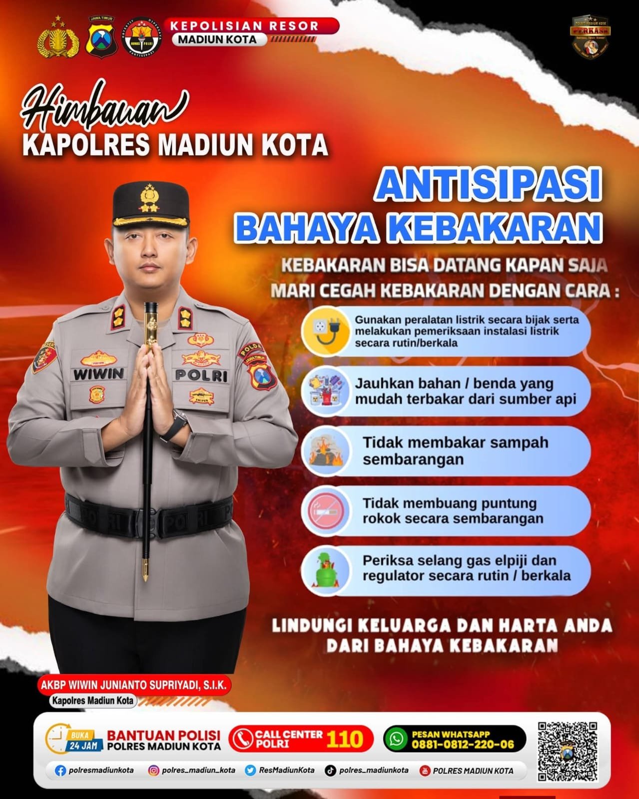 MEDIAINVESTIGASIMABES.CO.ID | MADIUN KOTA (JATIM) — Kapolres Madiun Kota, AKBP Wiwin Junianto Supriyadi, S.I.K., mengeluarkan instruksi tegas kepada seluruh lapisan masyarakat untuk meningkatkan kewaspadaan terhadap ancaman bahaya kebakaran. Imbauan ini disampaikan langsung di Mapolres Madiun Kota, Selasa, 21 April 2026.